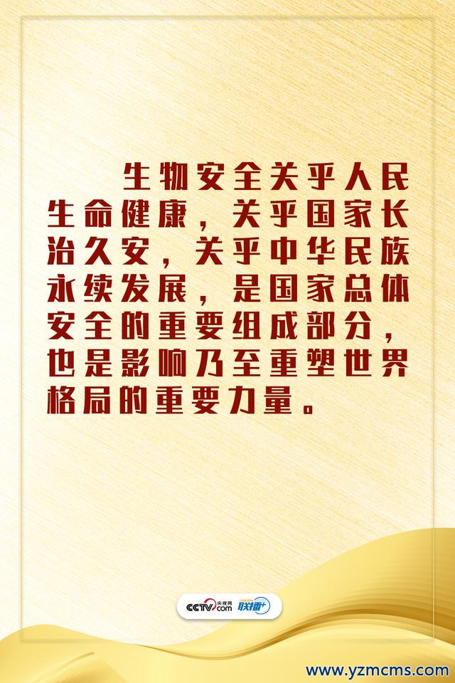 完善国家生物安全治理体系 ●加强战略性、前瞻性研究谋划,完善国家生物安全战略。 ●健全党委领导、政府负责、社会协同、公众参与、法治保障的生物安全治理机制,强化各级生物安全工作协调机制。 ●从立法、执法、司法、普法、守法各环节全面发力,健全国家生物安全法律法规体系和制度保障体系,加强生物安全法律法规和生物安全知识宣传教育,提高全社会生物安全风险防范意识。 ●夯实联防联控、群防群控的基层基础,打好生物安全风险防控人民战争。 ●坚持系统思维,科学施策,统筹谋划,抓好全链条治理。 ●织牢织密生物安全风险监测预警网络,健全监测预警体系,重点加强基层监测站点建设,提升末端发现能力。 ●快速感知识别新发突发传染病、重大动植物疫情、微生物耐药性、生物技术环境安全等风险因素,做到早发现、早预警、早应对。 ●建立健全重大生物安全突发事件的应急预案,完善快速应急响应机制。 ●加强应急物资和能力储备,既要储备实物,也要储备产能。 ●实行积极防御、主动治理,坚持人病兽防、关口前移,从源头前端阻断人兽共患病的传播路径。 ●立足更精准更有效地防,理顺基层动植物疫病防控体制机制,明确机构定位,提升专业能力,夯实基层基础。 ●强化生物资源安全监管,制定完善生物资源和人类遗传资源目录。 ●加强入境检疫,强化潜在风险分析和违规违法行为处罚,坚决守牢国门关口。对已经传入并造成严重危害的,要摸清底数,“一种一策”精准治理,有效灭除。 ●加强对国内病原微生物实验室生物安全的管理,严格执行有关标准规范,严格管理实验样本、实验动物、实验活动废弃物。 ●推进生物安全领域科技自立自强,打造国家生物安全战略科技力量,健全生物安全科研攻关机制,严格生物技术研发应用监管,加强生物实验室管理,严格科研项目伦理审查和科学家道德教育。 ●促进生物技术健康发展,在尊重科学、严格监管、依法依规、确保安全的前提下,有序推进生物育种、生物制药等领域产业化应用。 ●把优秀传统理念同现代生物技术结合起来,中西医结合、中西药并用,集成推广生物防治、绿色防控技术和模式,协同规范抗菌药物使用,促进人与自然和谐共生。 ●同国际社会携手应对日益严峻的生物安全挑战,加强生物安全政策制定、风险评估、应急响应、信息共享、能力建设等方面的双多边合作交流。 ●办好《生物多样性公约》第十五次缔约方大会,推动制定“2020年后全球生物多样性框架”,为世界贡献中国智慧、提供中国方案。 ●倡导本着科学原则、按科学规则推动新冠病毒溯源工作。 ●切实把思想认识和行动统一到党中央决策部署上来,把生物安全工作责任落到实处,做到守土有责、守土尽责。 ●加大投入力度,完善政策措施,强化要素保障,把生物安全建设重点任务抓实抓好抓出成效,提高生物安全风险防控和治理体系现代化水平,牢牢掌握国家生物安全主动权。 ●持之以恒抓好新冠肺炎疫情防控,坚决克服麻痹思想、厌战情绪、侥幸心理、松懈心态,从严从紧落实各项防控措施,守住来之不易的防控成果。